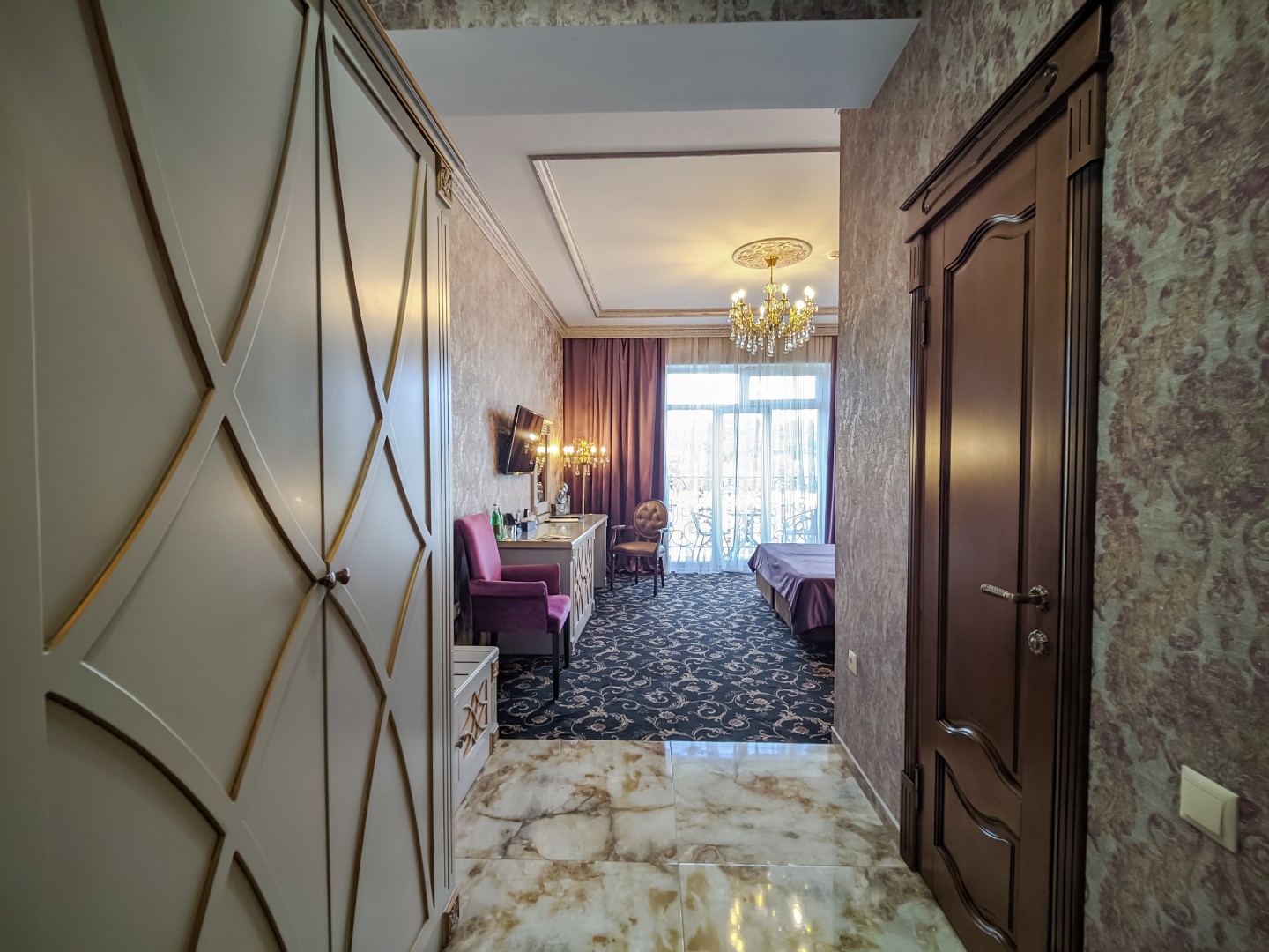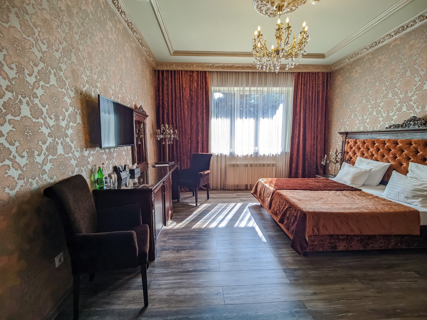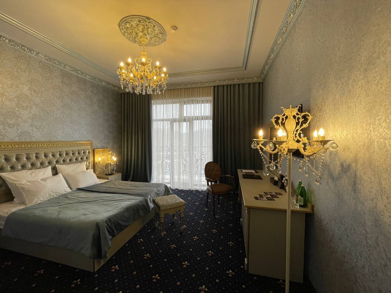 В номере: двуспальная кровать с размером «queen-size» с возможным разделением на 2 односпальные, прикроватные тумбы, светильники, торшер, туалетный столик и кресла, платяной шкаф, сейф, мини-бар, минеральная вода и вода без газа включенная в стоимость, кабельное ТВ, ЖК телевизор, Wi-Fi, кондиционер, необходимые принадлежности для ухода за верхней одеждой, гладильные принадлежности, балконы с прекрасным видом на футбольное поле и парковую зону, звукоизоляция.